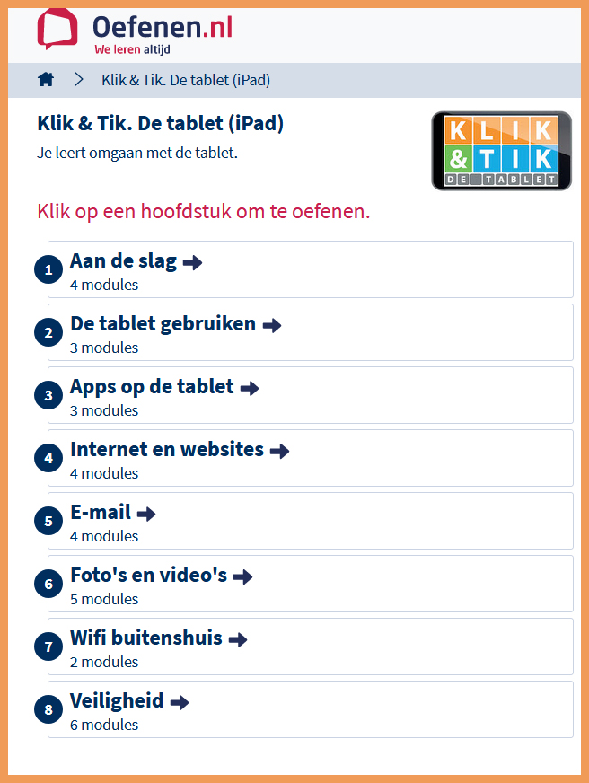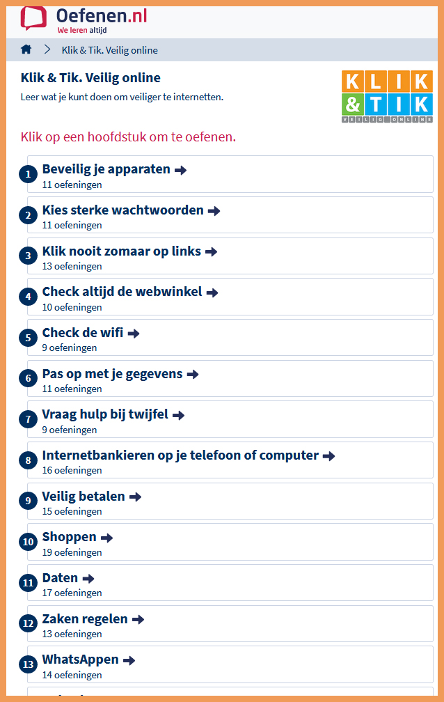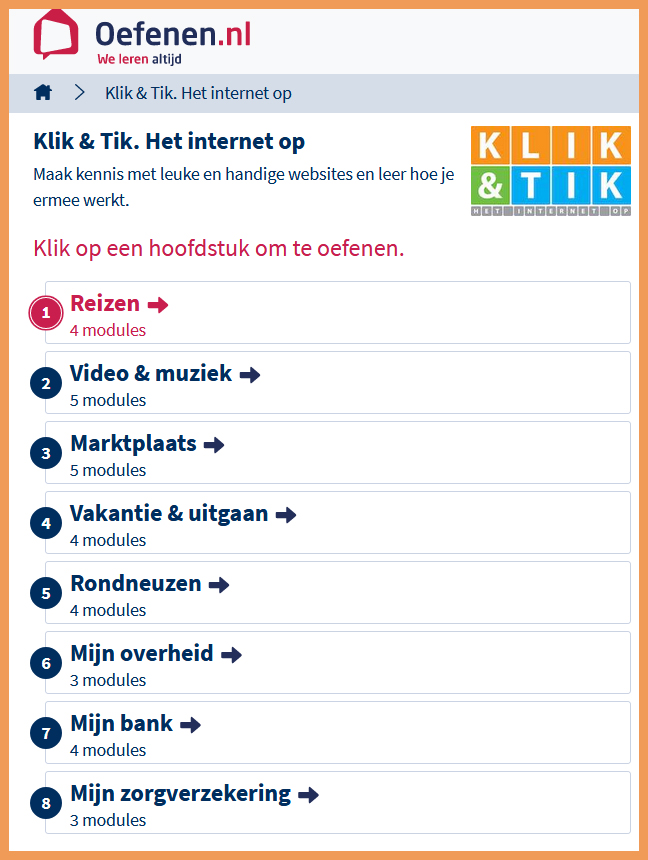 [description] => De cursus Klik & Tik brengt je verder met je kennis over de computer, internet, veilig online, je tablet en nog veel meer. Je kunt de oefeningen in eigen tempo doen en er zijn geen kosten aan verbonden. Een begeleider is aanwezig om je te helpen.